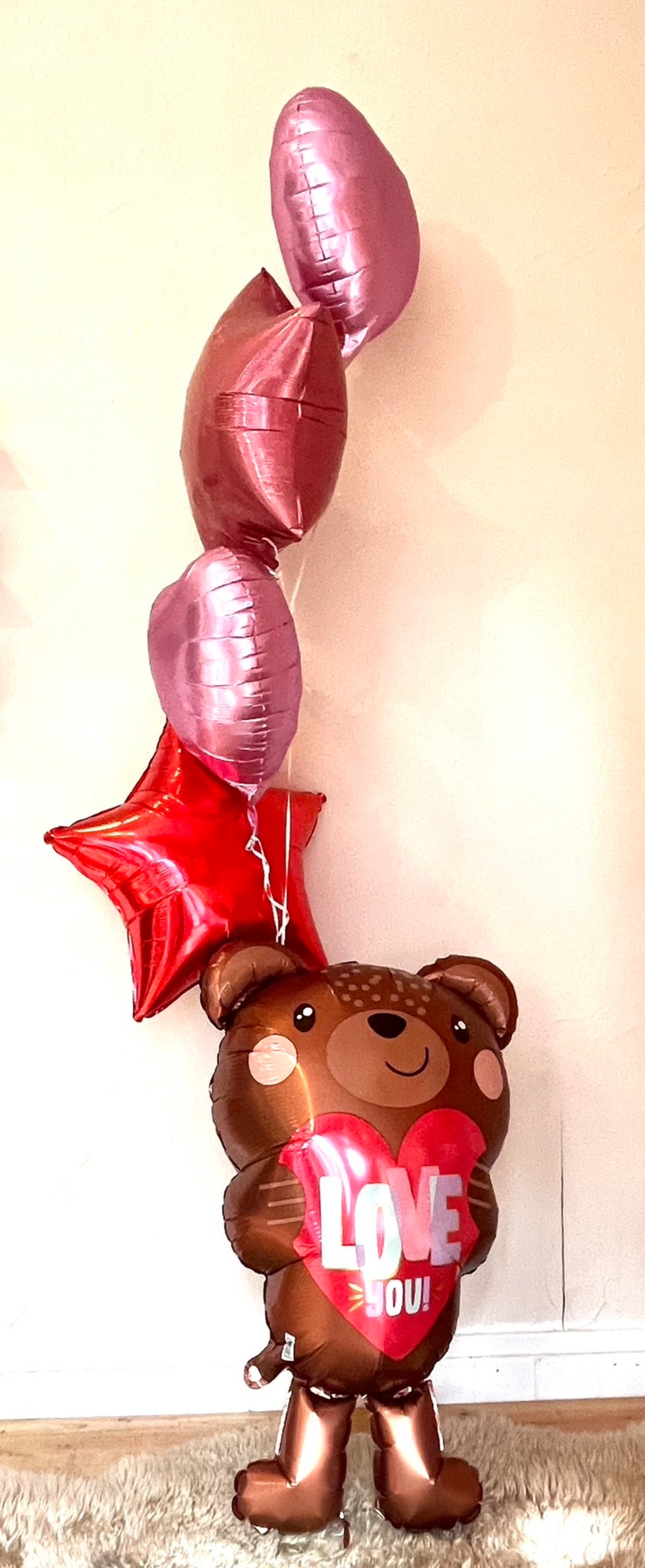 可愛らしいくまちゃんデザインのバルーンパフェが登場!ハートと星がアクセントに施されたユニークな形状は、お子様から大人まで楽しめるアイテムです。パーティーなどの特別な日はもちろん、インテリアとしてもお部屋に飾って楽しめます。